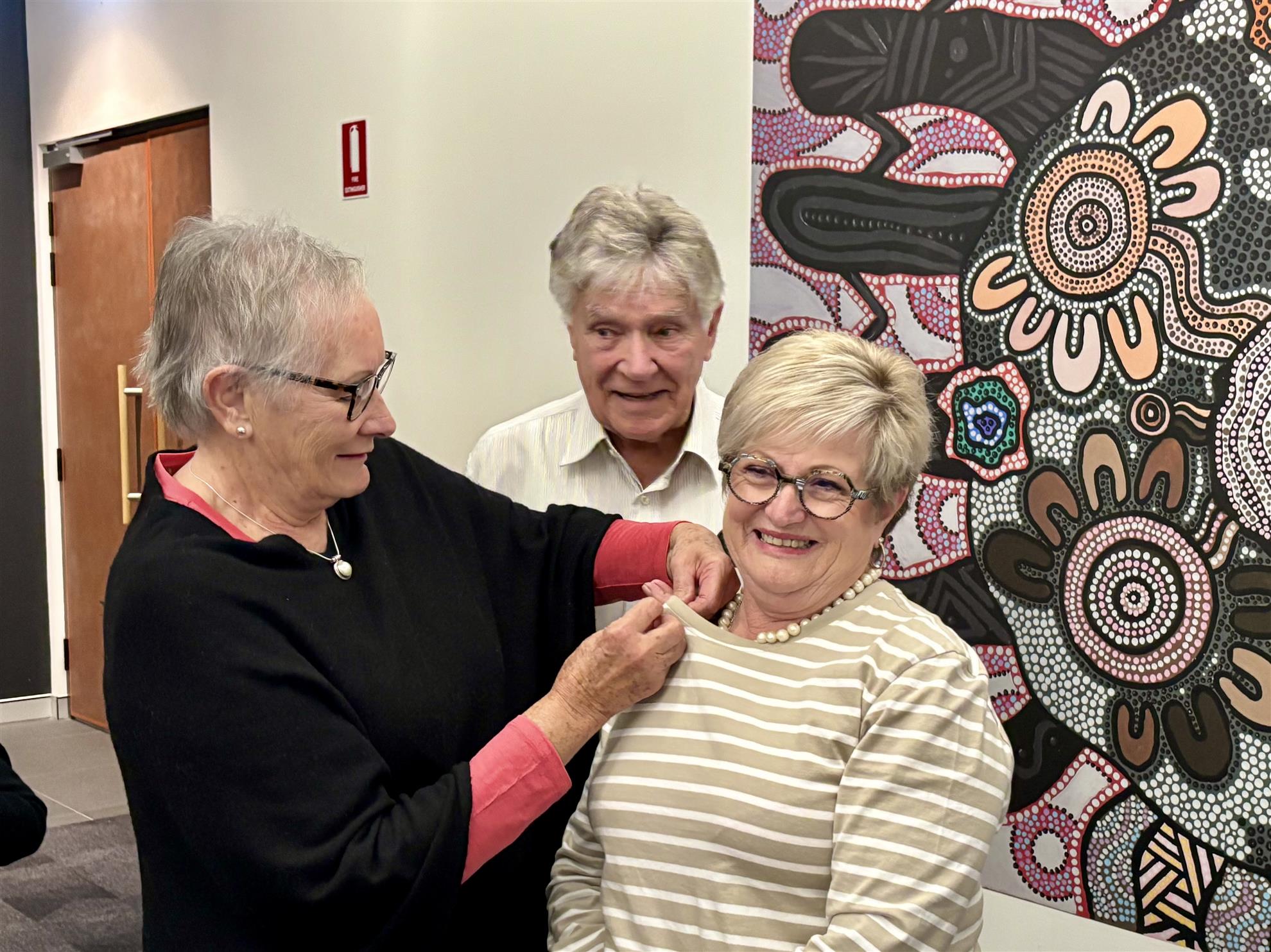 Margaret Anne Nowacki receives her new member pin from Margaret Taylor with Margaret anne's husband Guenter looking on.